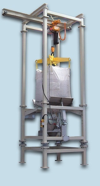 大袋開袋站是一個標準組件系統,是由吊架、電動葫蘆、起重導軌、支架、拍打裝置、夾袋裝置等組成;